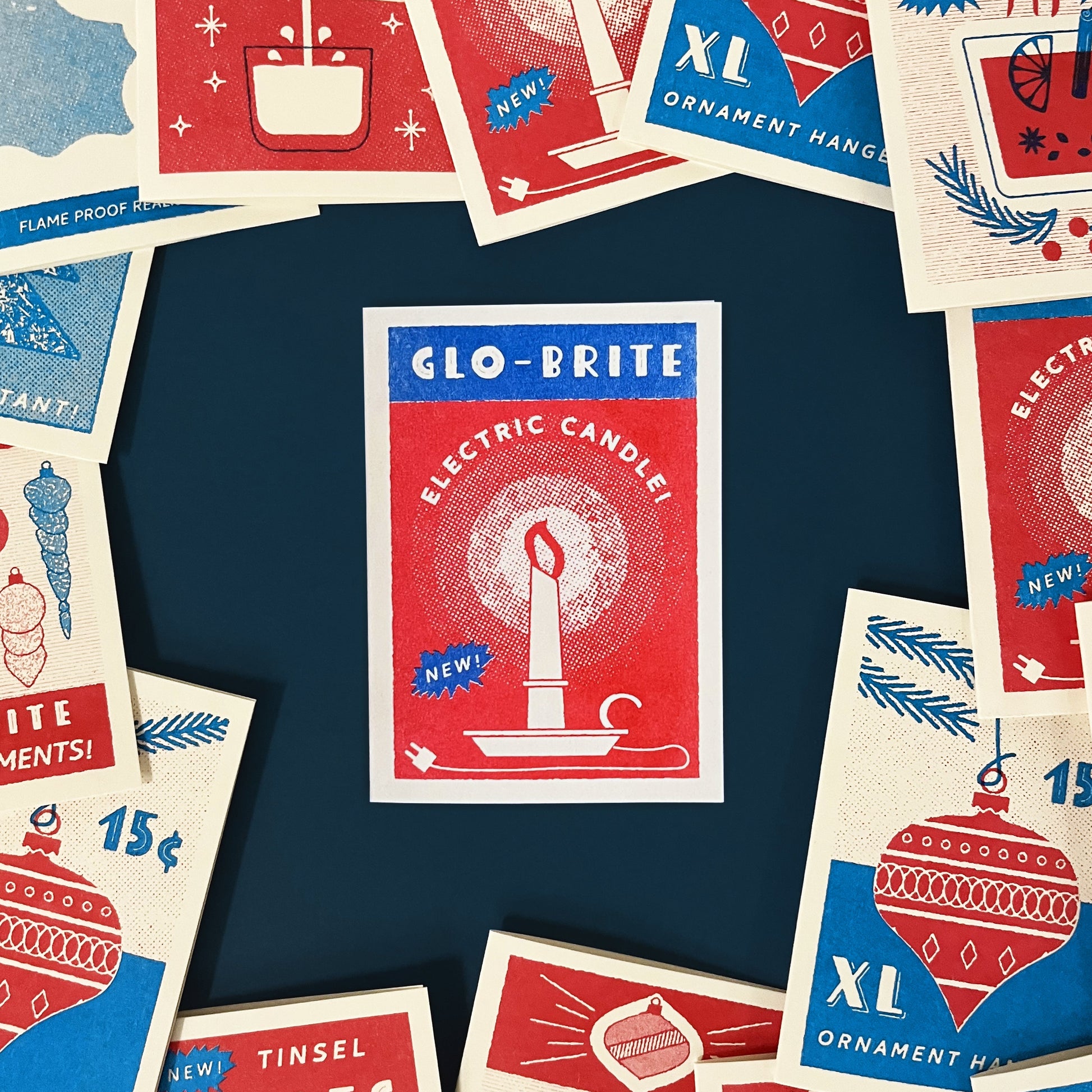 This design is inspired by packaging for electric candles, a decoration that became popular in the early 20th century. Printed in red and blue Risograph inks, the design has a beautifully tactile, slightly imperfect texture unique to risograph printing.